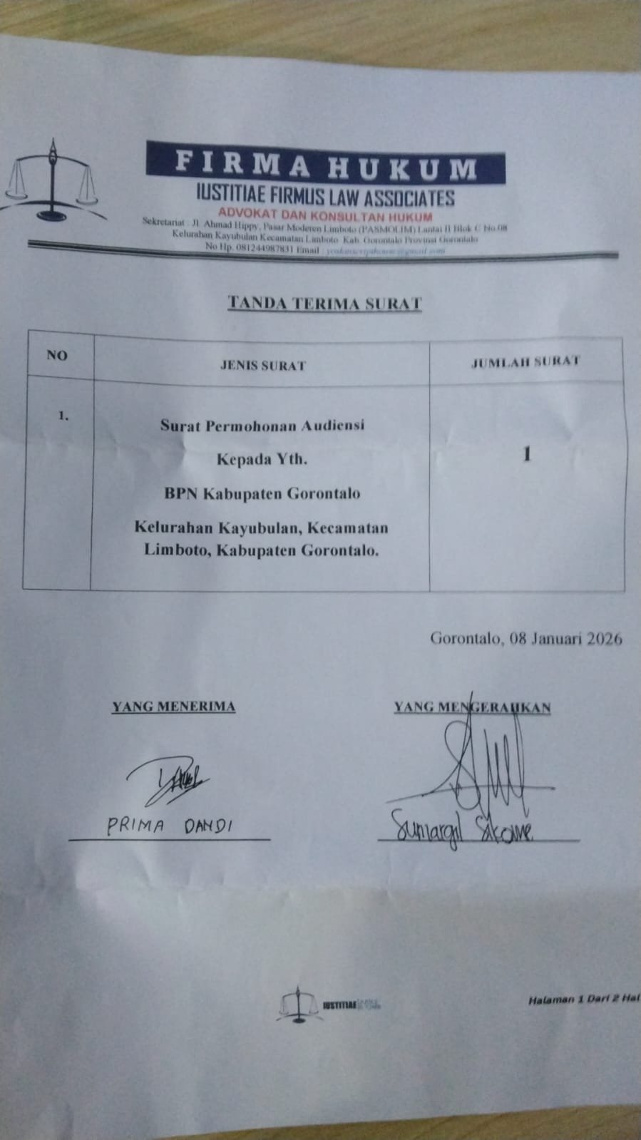 Tanda terima surat dari tim advokad, saat mengirim surat ke BPN Kabupaten Gorontalo