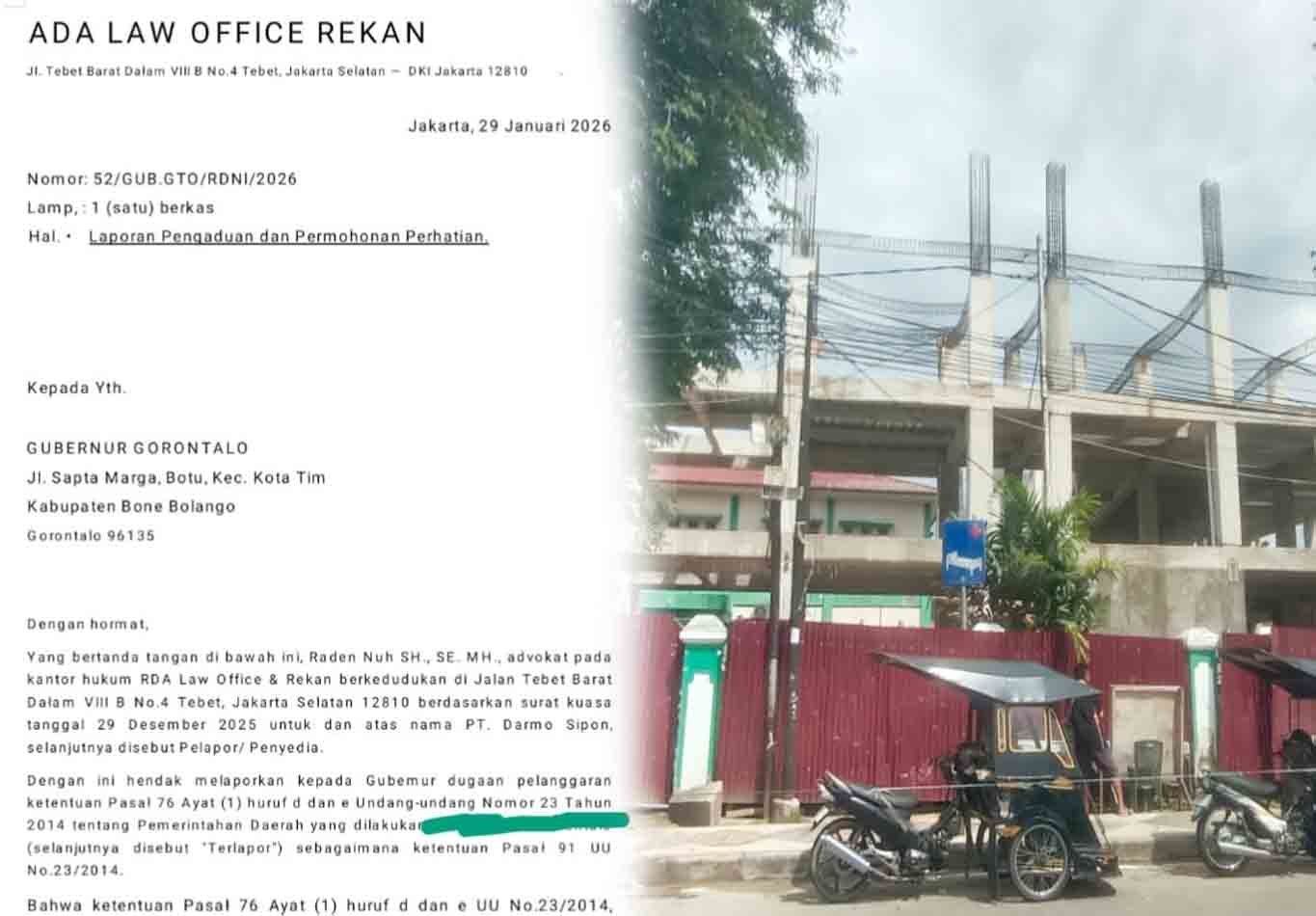 BUTOTA – GORONTALO PROV | Kantor hukum RDA Law Office & Rekan atas nama kliennya PT Darmo Sipon melaporkan seorang pejabat penting di Pemerintah Kabupaten Gorontalo, ke Gubernur Gorontalo. Laporan ini terkait dugaan pelanggaran Pasal 76 Ayat (1) huruf d dan e Undang-Undang Nomor 23 Tahun 2014 tentang Pemerintahan Daerah.
