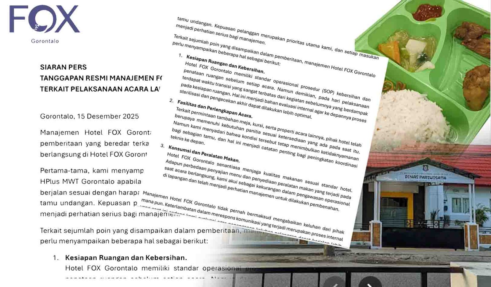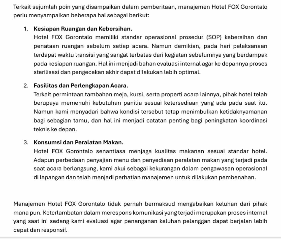 klarifikasi menejemen FOX hotel Gorontalo, pada rilis yang dikirim keredaksi BUTOTA, Pada Senin (15/12)