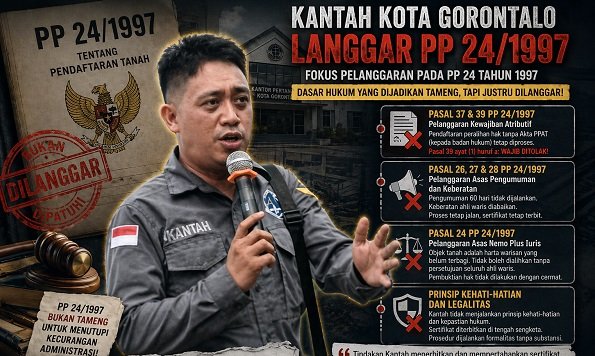 Melalui Jhojo Rumampuk, Kantah Kota Gorontalo disebut telah melakukan dua pelanggaran pada Peraturan Pemerintah nomor 24 tahun 1997. Kata Jhojo, Kantah melanggar Pasal 37 dan Pasal 39 PP 24/1997.