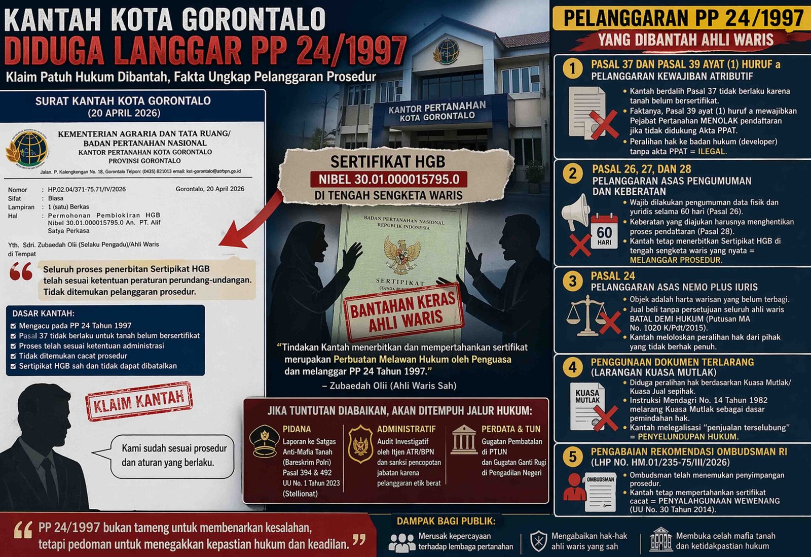 BUTOTA – GORONTALO, Pernyataan Kantor Pertanahan (Kantah,red) Kota Gorontalo yang bersandar pada PP Nomor 24 Tahun 1997 tentang Pendaftaran Tanah, kini dianggap justru menjadi titik lemah yang disorot tajam oleh pihak ahli waris keluarga Olii. Alih-alih memperkuat legitimasi, penggunaan regulasi tersebut dinilai keliru dan cenderung dipelintir untuk membenarkan proses yang cacat prosedur.