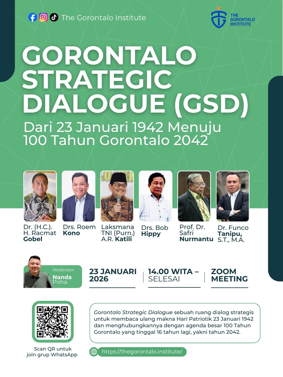 BUTOTA – GORONTALO | The Gorontalo Institute kembali menyelenggarakan Gorontalo Strategic Dialogue (GSD) pada Jumat, 23 Januari 2026, pukul 14.00 WITA hingga selesai. Kegiatan ini akan dilaksanakan secara daring melalui Zoom Meeting dengan kuota peserta terbatas.