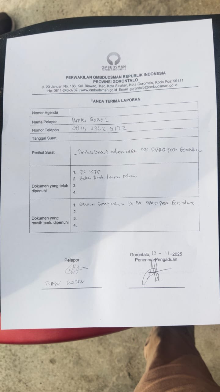 Kekecewaan atas tidak adanya respons dan transparansi dari DPRD Provinsi Gorontalo membuat Rifki memutuskan untuk mengambil langkah lebih lanjut. Ia melaporkan pihak DPRD ke Ombudsman RI, lembaga yang berwenang mengawasi penyelenggaraan pelayanan publik.