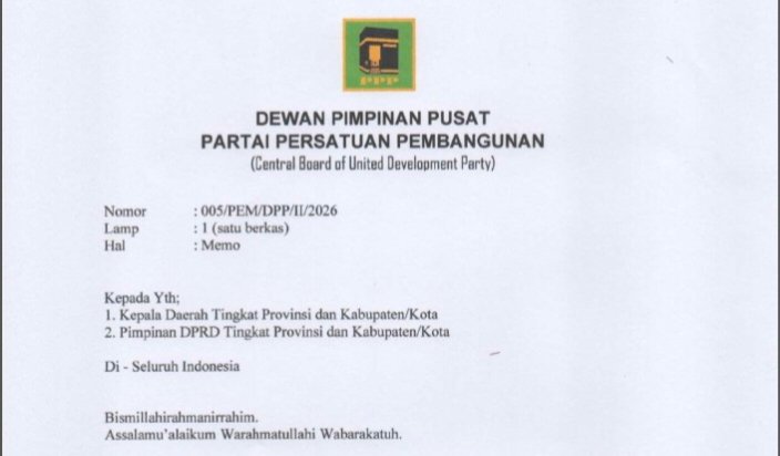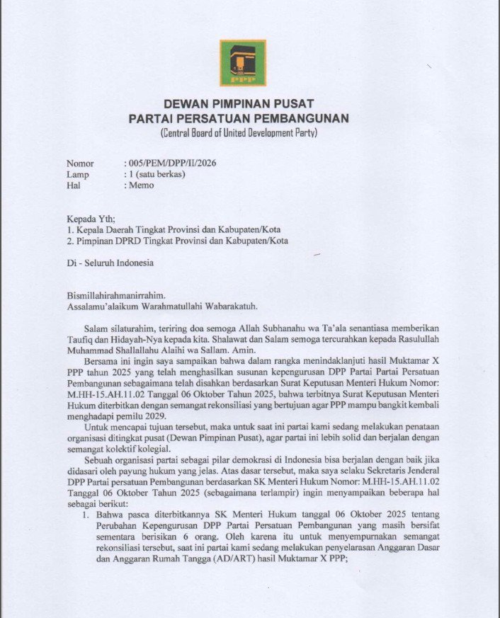 Memo bernomor 005/PEM/DPP/II/2026 tertanggal 3 Februari 2026 ini berisi permintaan penundaan dan pembatalan Surat Keputusan (SK) terkait pergantian kepengurusan partai di tingkat Dewan Pimpinan Wilayah (DPW).