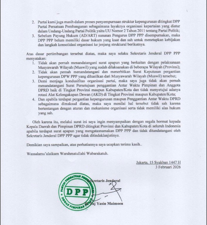 “Atas dasar pertimbangan tersebut diatas, maka saya selaku Sekretaris Jenderal DPP PPP menyatakan tidak akan pernah menandatangani surat apapun yang berkaitan dengan pelaksanaan Musyawarah Wilayah (Muswil) yang sudah dilaksanakan di beberapa Wilayah (Provinsi),” tegas Gus Yasin dalam memo yang ditandatangani di Jakarta pada 15 Syakban 1447 H atau 3 Februari 2026.