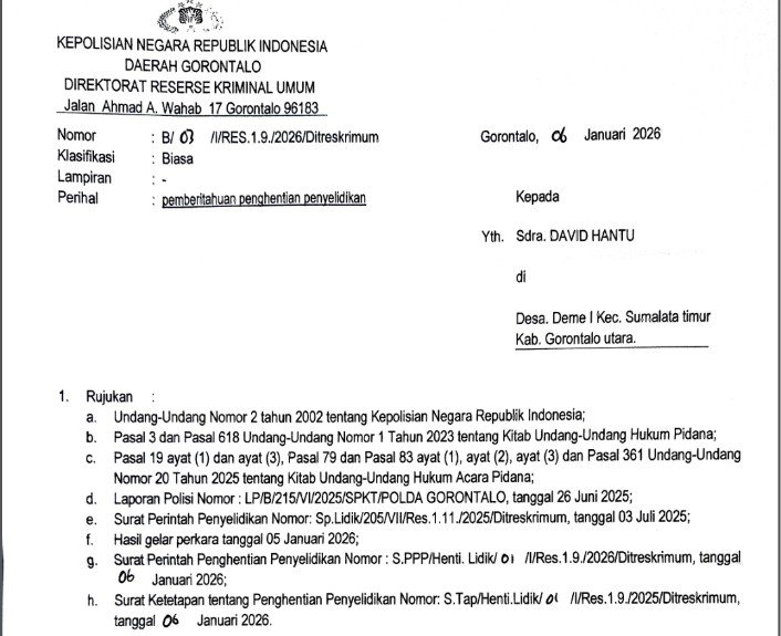 BUTOTA – GORONTALO PROV | Direktorat Reserse Kriminal Umum Polda Gorontalo, resmi menghentikan penyelidikan kasus dugaan pemalsuan dokumen ijazah yang melibatkan Wakil Bupati Kabupaten Gorontalo Utara, Nurjana Hasan Yusuf.