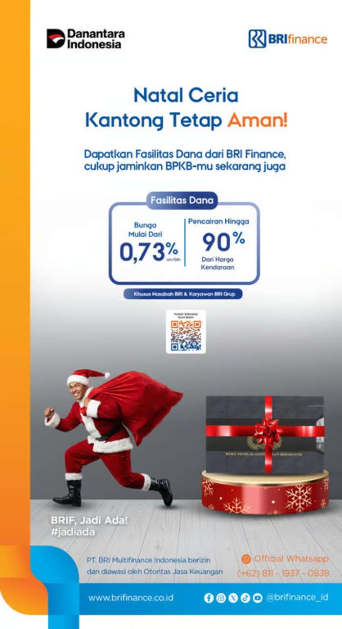 Akhir tahun kerap menjadi periode dengan tekanan pengeluaran tambahan, sehingga membutuhkan pengelolaan keuangan yang lebih cermat. Menjawab kebutuhan tersebut, BRI Finance menawarkan fasilitas pendanaan dengan jaminan BPKB kendaraan melalui skema yang kompetitif, proses yang cepat, serta akses yang semakin luas. Melalui program BRI Flash, masyarakat dapat memperoleh pembiayaan dengan bunga mulai dari 0,73% per bulan, pencairan dana hingga 90% dari nilai kendaraan, serta pilihan tenor fleksibel mulai dari 1 hingga 4 tahun, sehingga berbagai kebutuhan liburan dan pengeluaran akhir tahun dapat dikelola secara lebih strategis.