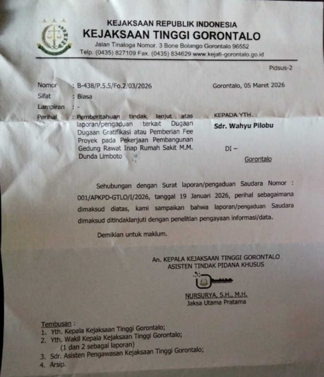 Surat pemberitahuan tersebut ditujukan kepada pelapor, yakni Wahyu Pilobua koordinator APKPD Provinsi Gorontalo. Dalam surat bernomor B-438/P.5.5/Fd.2/03/2026. Dimana, pihak Kejati Gorontalo menyatakan bahwa laporan yang diajukan oleh APKPD sedang dalam proses lebih lanjut.