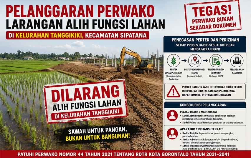 Perlu diingatkan Kembali bahwa wilayah Kelurahan Tanggikiki yang berada di Kecamatan Sipatana, secara tegas masuk dalam perencanaan tata ruang yang memiliki fungsi dan peruntukan tertentu. Artinya, setiap aktivitas pemanfaatan ruang termasuk perubahan fungsi lahan wajib tunduk pada ketentuan zonasi yang telah ditetapkan.